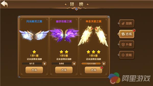 翅膀玩法大体来说分为四个部分:合成,升级,升星,技能。