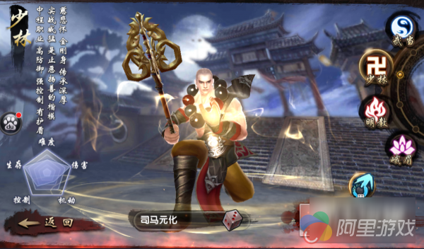 游戏职业分支采用原著中四大门派:少林、武当、峨眉、明教。选择门派时不仅提供文字介绍、还用五芒星图标示了该门派的难度、生存、伤害、控制、机动性。