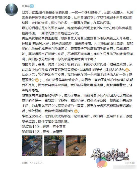 在武侠小说中,男女主角很多都是不打不相识,从起初的一对儿小冤家,慢慢相知相恋,最后终成眷属。如今这样经典的桥段就发生在了《倚天屠龙记》手游中,相信这位“老蘑菇”玩家的经历在倚天江湖中不是唯一一例。这样从敌对阵营转为相恋相伴的侠侣,一同携手江湖,妙哉妙哉!