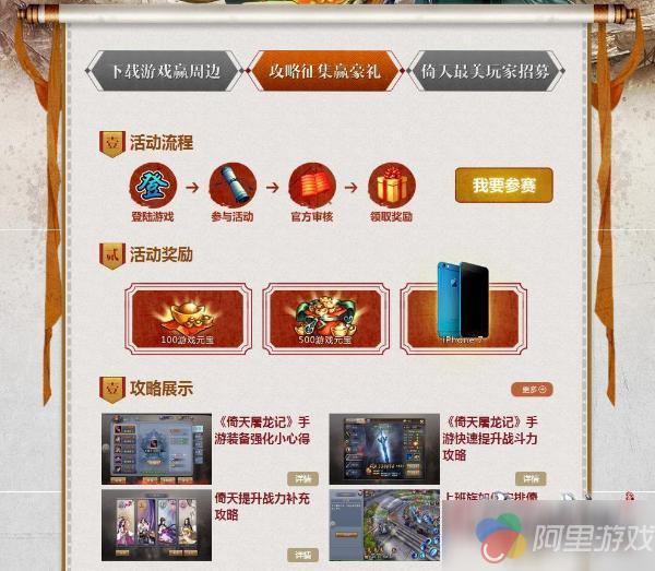 下笔如刀,仗剑江湖。系列活动之二倚天攻略火热征集中,在《倚天屠龙记》手游的江湖中,有多少初来乍到的年轻侠客,面对繁华的大都、高手如云的大帮派,满满的迷茫与不知所措。这种时候,如果能有一个导师站出来指点迷津,没准就挽救了一个武侠奇才!无论你是PK王者、带团老司机、理财大师还是外交达人,请把你的心得体会or竞技攻略分享出来,拯救迷失小羔羊,还有最高500绑定元宝拿,上不封顶噢!