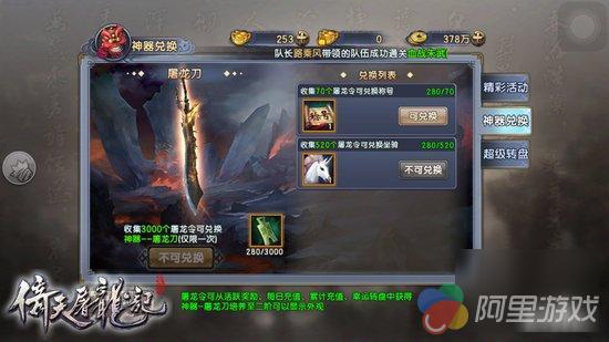 小说中想要得到神器屠龙刀难过登天,在游戏中虽然也不易,但是只要坚持就会有收获!每日通过活跃度奖励、充值、幸运转盘活动中获取屠龙令,攒够3000个即可在活动界面兑换神器—屠龙刀!如果坚持不下来,那么在中途也可以兑换坐骑、稀有称号等奖励。