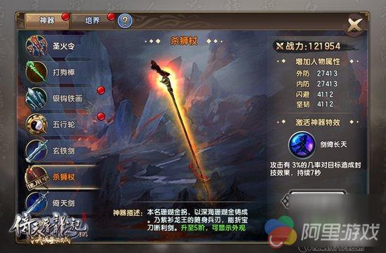 在官方曝光的这张神器属性界面图中可以看出,杀狮杖主要是增加人物的外防、内防、闪避和坚韧属性,同时,拥有杀狮杖还可以激活神器特效【剑倚长天】,使玩家在攻击时有3%的几率会对目标造成封技效果,并持续7秒,妥妥的PK神技。