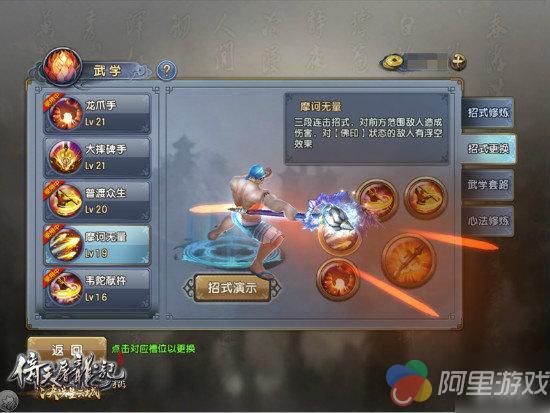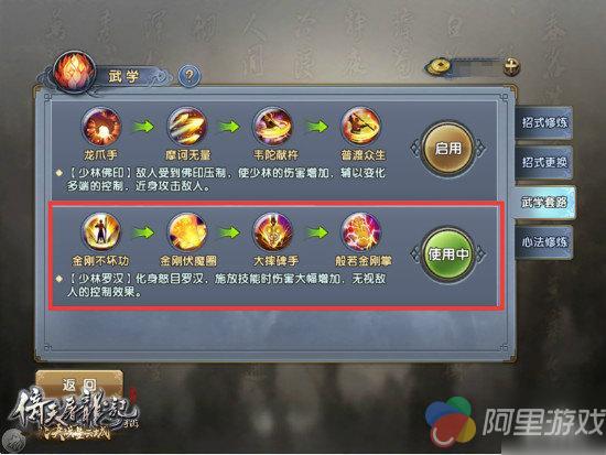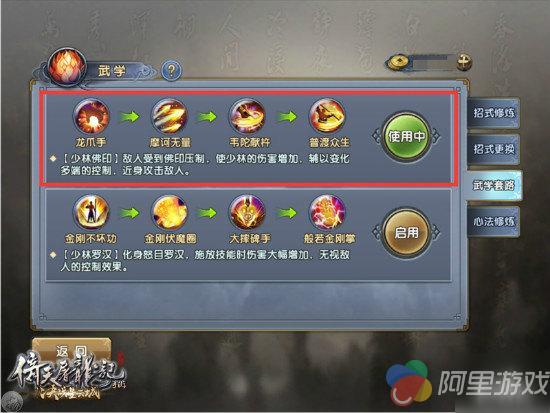 各位少侠在启用武学套路时可看到,【少林佛印】套路是通过使敌人受到佛印压制,使少林的伤害增加,辅以变化多端的控制,从而近身攻击敌人。
