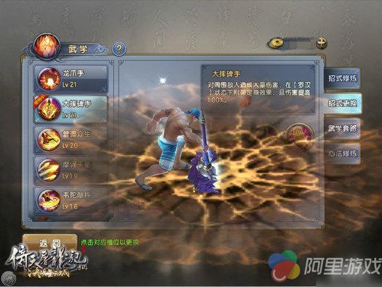 大摔碑手-千手千眼式:有罗汉BUFF时会对周围敌人造成大量伤害并附带定身效果,搭配上千手千眼式心法,最后一击的暴击率增加55%,基本上一通乱捶爆死一片。