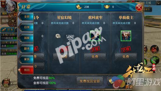 此外,如果玩家没有足够的时间进行游戏,那么每日的重回虎牢关、单骑救主、星宿幻境三个副本在没有时间手动或者挂机完成的情况下,也可省去当日的直接扫荡,反而可以利用第二日的找回获取人物以及坐骑装备。这三个副本结算并不会得到经验,找回也并不会消耗金券,这反而省下了购买免做令的费用。