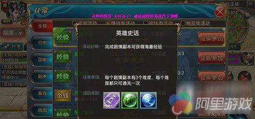 我们点击主界面右上角的“日常”,你会发现不管在全部活动中还是经验类活动中,英雄史话的星级都是五星且是最高的,也是排在第一首先推荐的。将军们的等级越高,该副本的难度就越大。完成英雄史话可以获得海量经验和属性点,同时也让将军们体验了不同角色的技能。