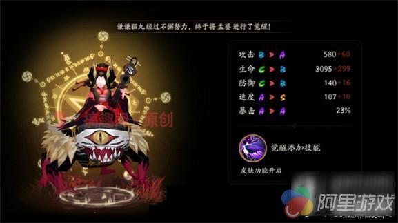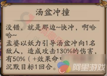 觉醒后新增被动技能,孟婆引导汤盆冲向1名敌人,造成攻击力130%的伤害,有50%(+命中效果)的概率沉默目标1回合。