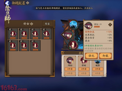 通常而言,为主攻击型式神佩戴攻击加成御魂,为防御型式神增加生命上限或防御加成的御魂,为辅助型式神增加速度等都是常见的选择,在具体式神选择中,网切、破势、针女等2件套增加15%暴击的御魂常被用于输出式神,而火灵、招财猫等拥有生命、防御及鬼火加成的御魂常被用于辅助式神。明确不同御魂的功能和分工,结合式神情况或战斗情况,能够最大幅度地提升战斗效果。