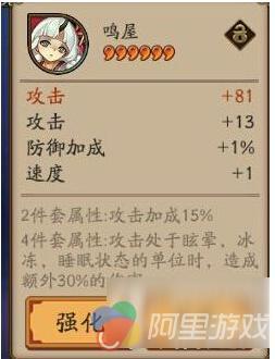 鸣屋2件提供攻击加成15%,4件攻击处于眩晕,冰冻,睡眠状态的单位时,造成额外30%的伤害。