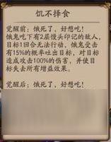 觉醒后:饿鬼吃下有2个馒头印记的敌人,目标1回合无法行动,饿鬼受到攻击有15%的概率吐出目标,并使目标失去所有增益效果,对敌方全体造成攻击100%的伤害。