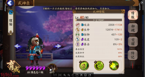 阵容中的黑科技,狰配合链子的反击可以形成无法驱散的点控,使得对手节奏断档,后期在对面叠满酒气并且自身带有攻击加成的时候可以打出大量AOE伤害。狸猫是对付雨火流的核心所在,所以效果抵抗一定要堆高,同时兼顾一些效果命中来增加普攻嘲讽的命中率。