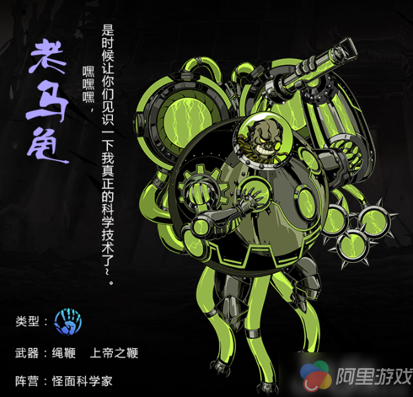 Hi~大家好,我叫老马龟,一个擅长用毒的科学怪人。喜欢荧光绿,就连技能也是荧光绿,科学对于我来说就是真理,看下我研究的科学成果吧。