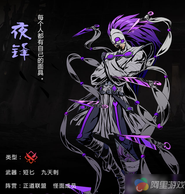 以紫色和灰色为主色彩,深灰色将亮紫色的外形烘托的十分帅气。夜的武器原本是青铜短剑,以迅捷狠辣为主,被绷带缠绕成了近似木乃伊的样子,用身上的绷带同时控制六柄短剑。不过对于木乃伊这个形象小编还是十分喜欢的。(难道是天生喜欢奇怪的形象,谁叫美术设计的很时尚呢?)