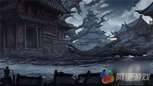 庞镇是烨城周边第一重镇,原是商旅不绝的繁华之所,如今却被恐怖的气氛笼罩。残阳落尽最后一丝余晖,虽是暮色四合,楼宇中却丝毫不见人间烟火的气息。压抑黑灰色成为画面的主色调。由远至近给人以强烈的视觉冲击,不知不觉就把目光聚焦到画面中央的空地。在如此萧瑟的地方与各路高手较量,内心油然而生悲辛与苍凉。