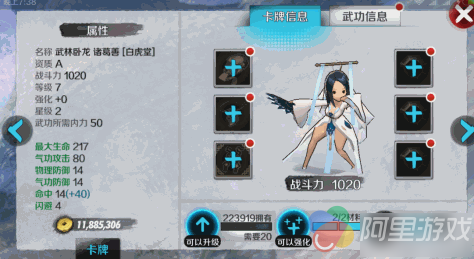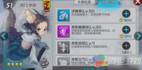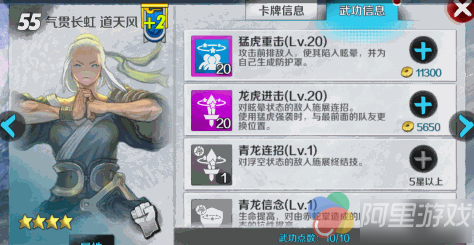 【极限猛虎拳】攻击敌方单体,使其陷入眩晕状态,并提高同排队友的闪避能力。同排队友:效果1:10秒内闪避+1323。敌人单体效果1:造成375%+X伤害(升级后+31),效果2:3秒内眩晕。效果3:损失10内力。