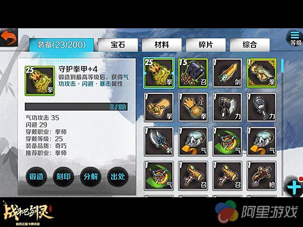 背包里的物品会分为装备、宝石、材料、碎片、综合五大类别。当物品比较多的时候,可以通过右上角的类别排序,来快速找到自己需要的物品。比如装备,既可以按照等级排列,也可以按照职业。