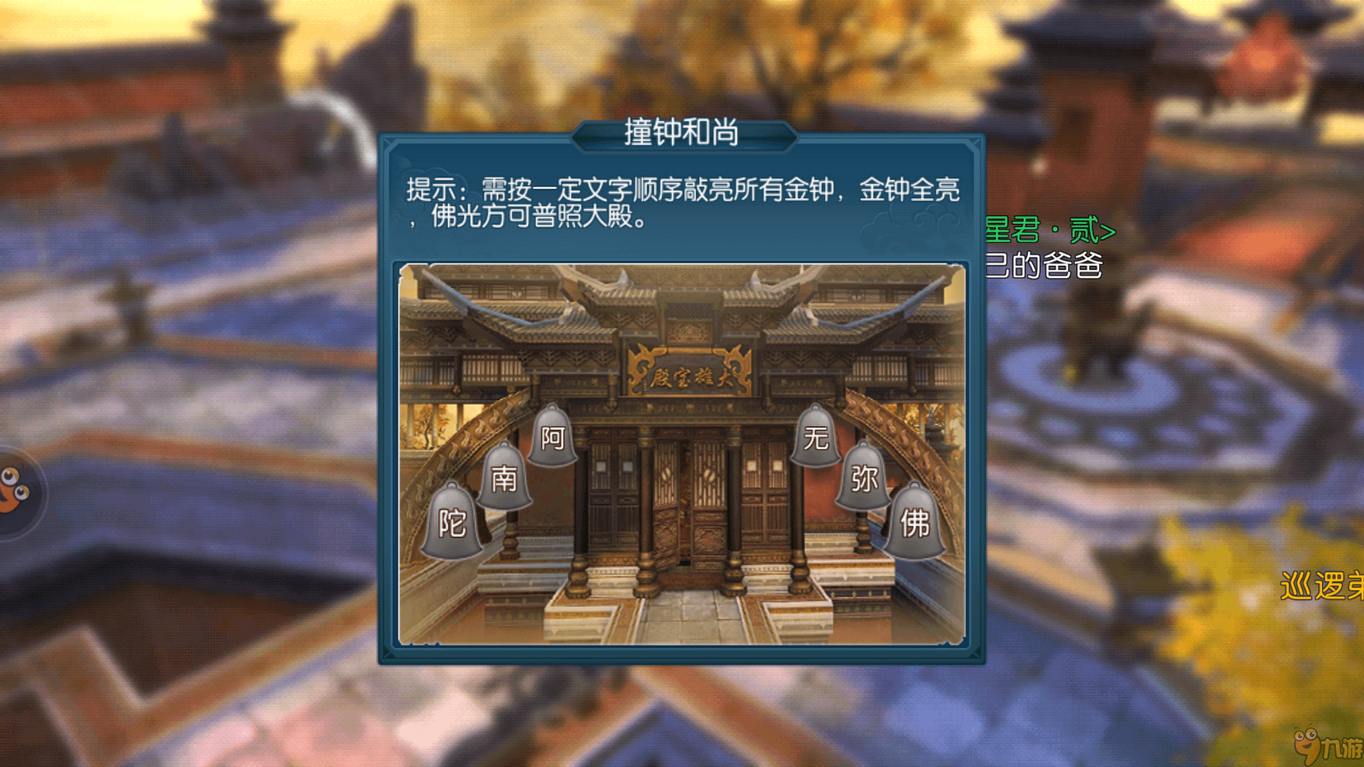 【方法】35级后到天音找法相,会出现一个图片让你拼顺序,按照“南无阿弥陀佛”的顺序点击即可。