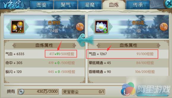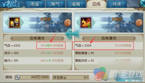 2级称为满手法宝,血炼一次增加法宝经验100点左右。