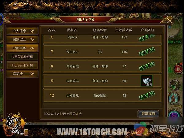 除此之外,为了表彰为国家浴血奋战的将士,为国杀敌的“护国英雄”将获得丰厚的银两奖励。想要拿“护国英雄”前十名,就要多多杀敌,击败人数多的玩家可以进入“护国英雄”排行榜,次日领取银两作为护国奖励。