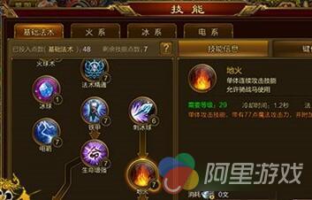 地火为基础法术。学满7级,单体攻击技能77魔法攻击力并附带55点额外伤害,绝对是角色成长期各种场合必用技能,砸镖车强货物、砍大臣、打BOSS必点技能之一。地火同时也是低等级挂机公认必用技能。
